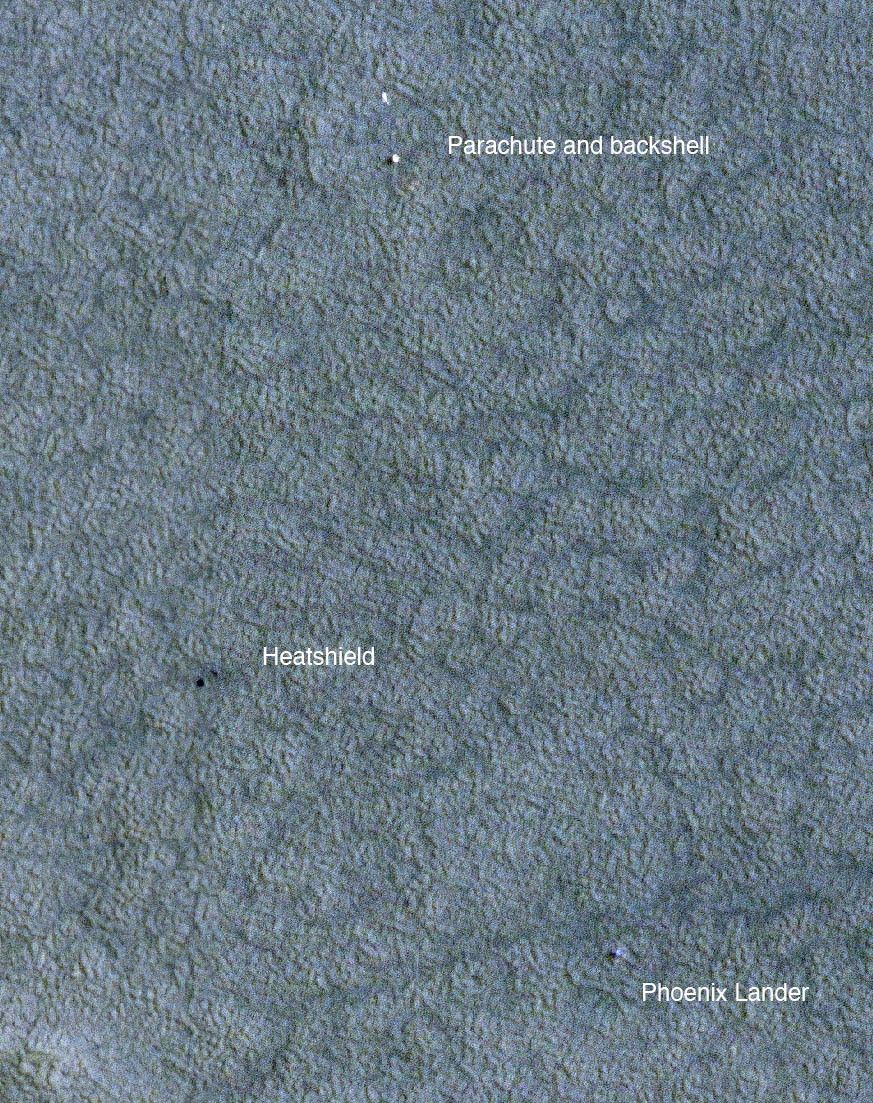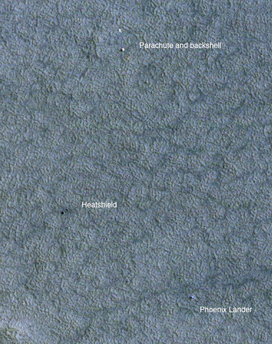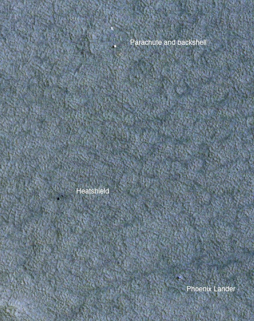 Summer turned to autumn for the Phoenix Mars Lander on December 26, 2008. This image, taken on December 21 by the High Resolution Imaging Science Experiment (HiRISE) camera on NASA's Mars Reconnaissance Orbiter, shows the lander during the last waning days of northern hemisphere summer.