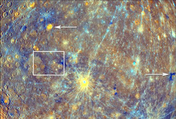 This color context image shows equatorial regions on the side of Mercury seen during MESSENGER’s departure from Mercury on October 6, 2008. Mercury’s true colors are very subtle (see PIA11364), but statistical methods can take advantage of the ability of MDIS to take pictures in 11 narrow color bands spread across visible and near-infrared wavelengths (400 to 1050 nm). Such methods greatly enhance subtle color differences in the materials at Mercury’s surface, providing insight into the compositional variations present on Mercury and the geologic processes that created those color differences. The bright yellow halo around Kuiper crater (62 kilometers (39 miles) in diameter; just below center) stands out as bright and colorful mostly because of its young age (see PIA11355). When the crater was formed, material from beneath the surface was ejected outwards and formed the bright surrounding blanket. As time passes, this young material will suffer micrometeorite impacts and the ravages of solar wind bombardment and will gradually become darker and redder. Several hundred million years from now, Kuiper’s distinctive rays will fade into the background. The wispy blue linear features are rays from distant young impact craters. The bright orange material (left arrow) in the floor of Lermontov crater (152 kilometers (94 miles) in diameter) was most likely deposited by volcanic eruptions in Mercury’s distant past. A mysterious dark bluish material is seen in many places on Mercury, and new data from the second flyby reveal a small area with a high concentration (right arrow) (see PIA11357). Once MESSENGER goes into orbit about Mercury, its full complement of instruments will examine these diverse locations and help unravel the processes that accompanied formation and later modification of Mercury’s crust. North is up for this image, and the white box indicates the boundaries of a close-up view of a portion of this scene (see PIA11410).