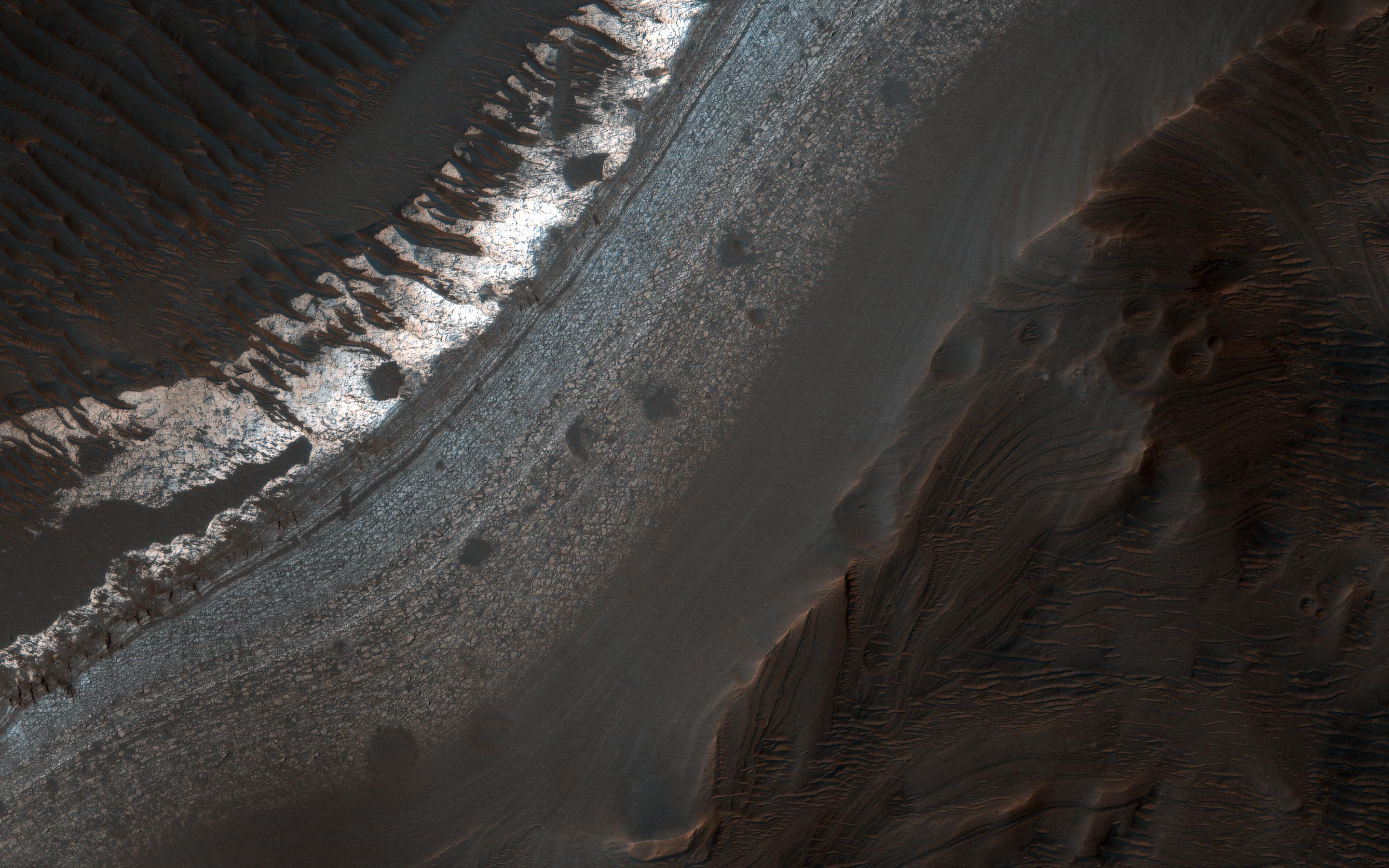 In this location, the deposits appear beneath a cap of alluvial fan materials (tan to brown in this image). Within the deposits, individual layers are nearly flat-lying and can be traced for hundreds of meters to kilometers. Information from the CRISM instrument on the Mars Reconnaissance Orbiter suggests that at least some of these beds contain clays.