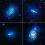 NGC 300 is seen in the image in the upper left panel. This is a textbook spiral galaxy. In fact, it is such a good representation of a spiral galaxy that astronomers have studied it in great detail to learn about the structure of all spirals in general. Infrared images like this one from WISE show astronomers where areas of gas and warm dust are concentrated -- features that cannot be seen in visible light. This gas and dust is primarily found near star-forming regions in the spiral arms. There isn't a significant amount of gas and dust in the central core in this type of spiral galaxy, so it appears relatively dim. At about 39,000 light-years across, NGC 300 is only about 40 percent the size of the Milky Way galaxy.