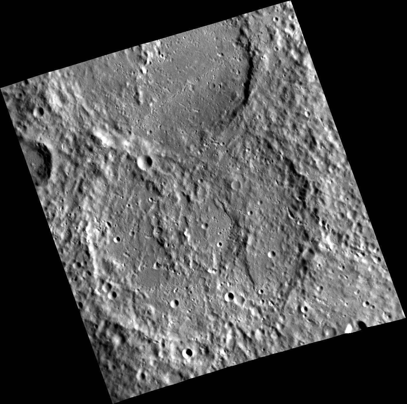 Two large, highly degraded impact craters dominate this view. The top one is Delacroix. The southern rim of Delacroix cuts the northern rim of Shelley, indicating that Shelley is older. Both craters are ancient, with battered rims and interiors that have suffered countless impacts and infilling with volcanic and/or ejecta material.