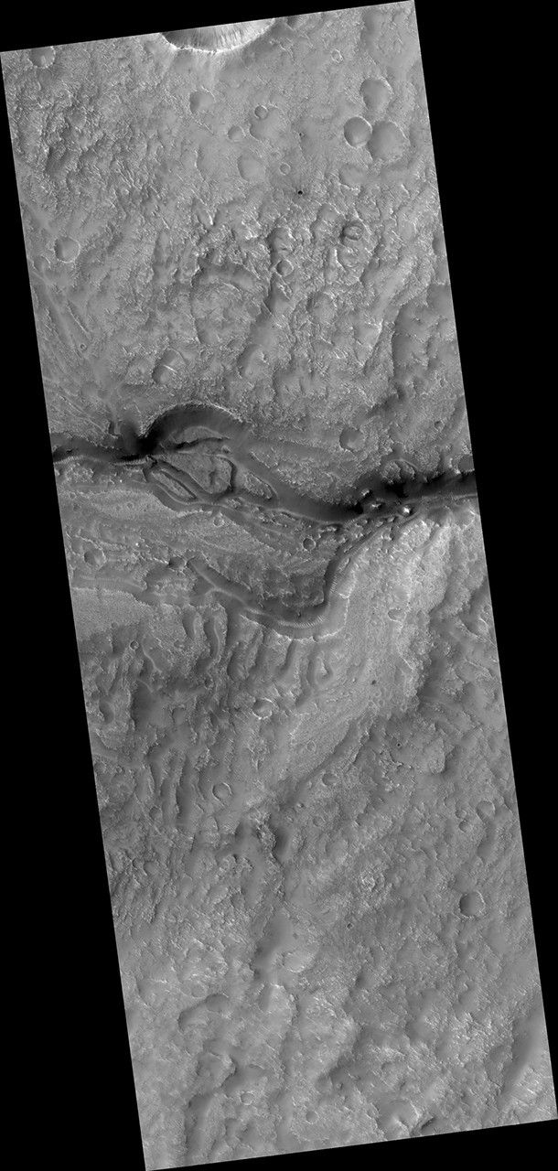 In this case, the valleys cut through a small, kilometer size impact crater. As it did so, the flow appears to have divided it into as many as three streams and then coalesced as it exited the other side.