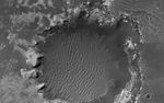 An approximately 1-kilometer impact crater located in northern Sinus Meridiani has formed along the boundary of two different terrain units. The western part of the crater has formed along a unit consisting of wind-blown basaltic materials that overlie light-toned units exposed in the crater wall.
