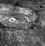 This image provides a zoomed in view of a type of crater that is very popular on Mercury's surface: craters with central peaks. It also highlights this unnamed crater's wall slumps, an irregular depression on the crater floor, and bright hollows that appear to dot the crater. This image is not map projected and South is at the top of the frame.