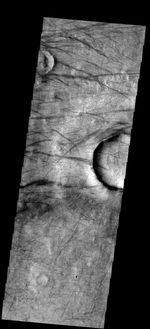 Note: this THEMIS visual image has not been radiometrically nor geometrically calibrated for this preliminary release. An empirical correction has been performed to remove instrumental effects. A linear shift has been applied in the cross-track and down-track direction to approximate spacecraft and planetary motion. Fully calibrated and geometrically projected images will be released through the Planetary Data System in accordance with Project policies at a later time.