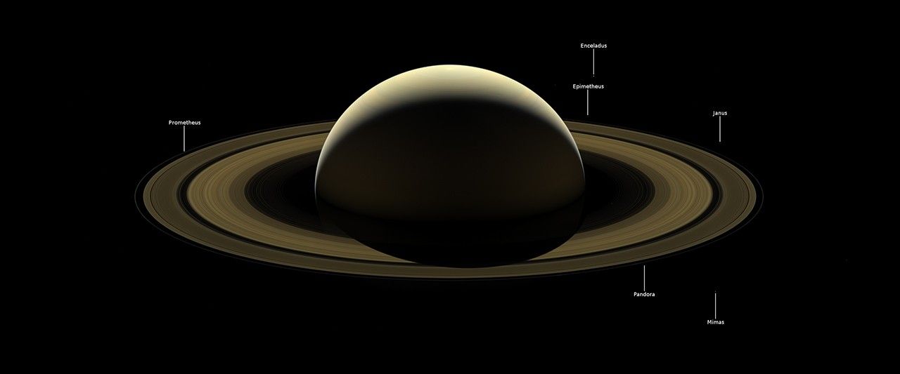 The ice-covered moon Enceladus -- home to a global subsurface ocean that erupts into space -- can be seen at the 1 o'clock position. Directly below Enceladus, just outside the F ring (the thin, farthest ring from the planet seen in this image) lies the small moon Epimetheus. Following the F ring clock-wise from Epimetheus, the next moon seen is Janus. At about the 4:30 position and outward from the F ring is Mimas. Inward of Mimas and still at about the 4:30 position is the F-ring-disrupting moon, Pandora. Moving around to the 10 o'clock position, just inside of the F ring, is the moon Prometheus.