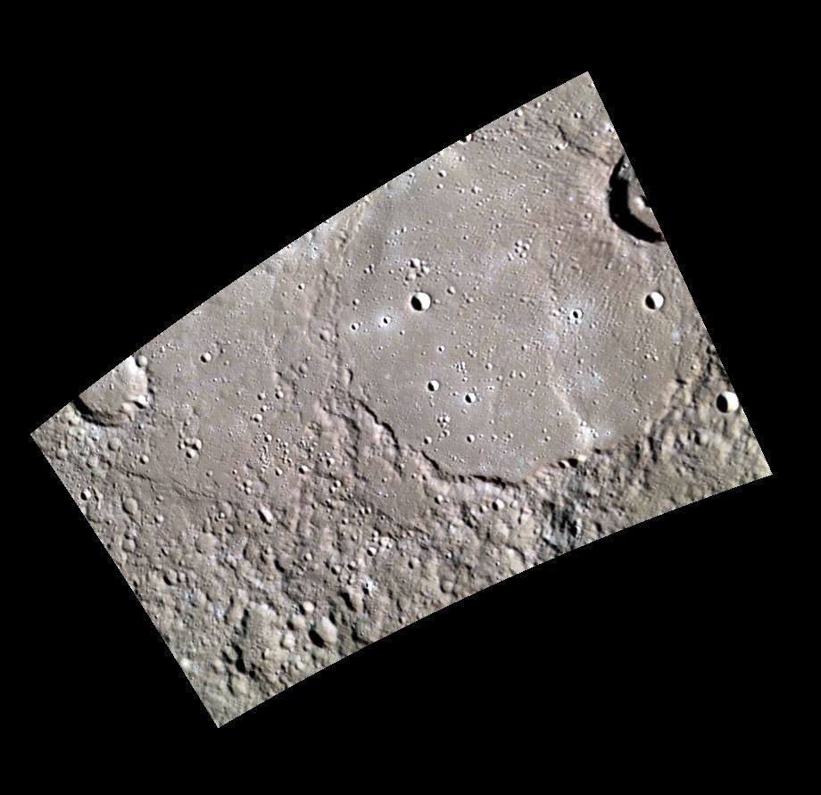 The large crater seen here, located in Mercury's northern plains, exhibits signs of extensive flooding by lava. Similar to ghost craters that have been completely covered by volcanic flows, much of Monteverde's northern rim and interior have been flooded and filled in by lava. Only the remains of Monteverdi's southern rim jut above the relatively flat interior of the crater. This crater was named after the Italian composer Claudio Monteverdi (1567-1643), whose music marks the transition from the Renaissance style of music to the Baroque style.