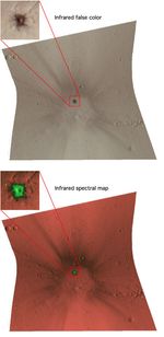 The bottom image is a spectral map constructed using measurements of the 544-color spectra that separate dust and rock. The bright, deep orange areas are undisturbed dust. The crater rays' chocolate color in this rendition shows that they are slightly darker, more packed-down soil that was exposed by reimpacting boulders. The bright green color immediately around the new crater (inset) is where mafic rock (rock rich in the iron- and magnesium-containing minerals pyroxene and olivine) have been exposed.
