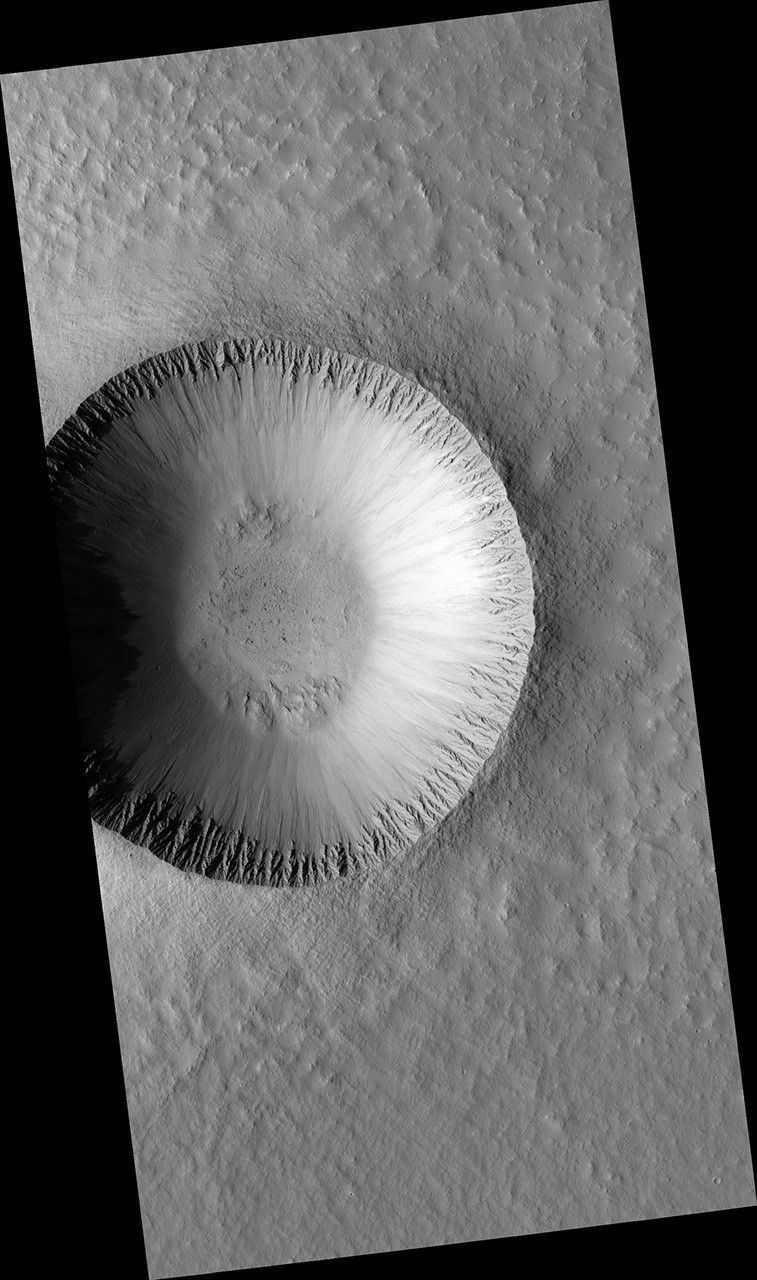 This image is of an approximately 5 kilometer (approx. 3.1 mile) diameter crater that is one of the rare examples of a fresh "lunar-like" crater on Mars. The impact crater formed in the Tharsis region, which is the volcanic region on Mars that harbors the great Olympus Mons volcano -- in fact, this crater lies just 150 kilometer (94 miles) from the flanks of Olympus.