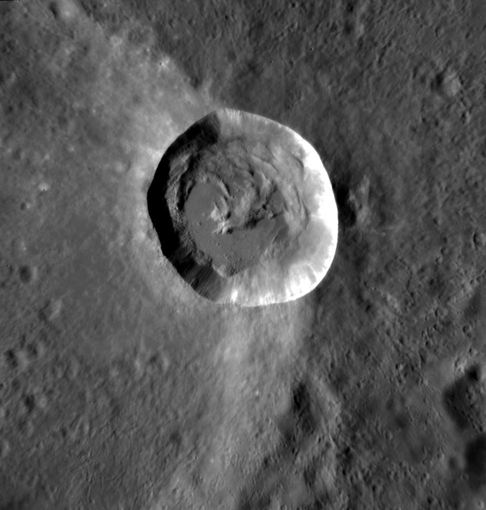 Here we get a closer look at the fresh, bright-rayed crater Mena. Solidified impact melt forms a smooth pond on the western side of the crater floor. This asymmetry is due to the fact that Mena formed on the sloping rim of an older crater, as seen in this wider view.