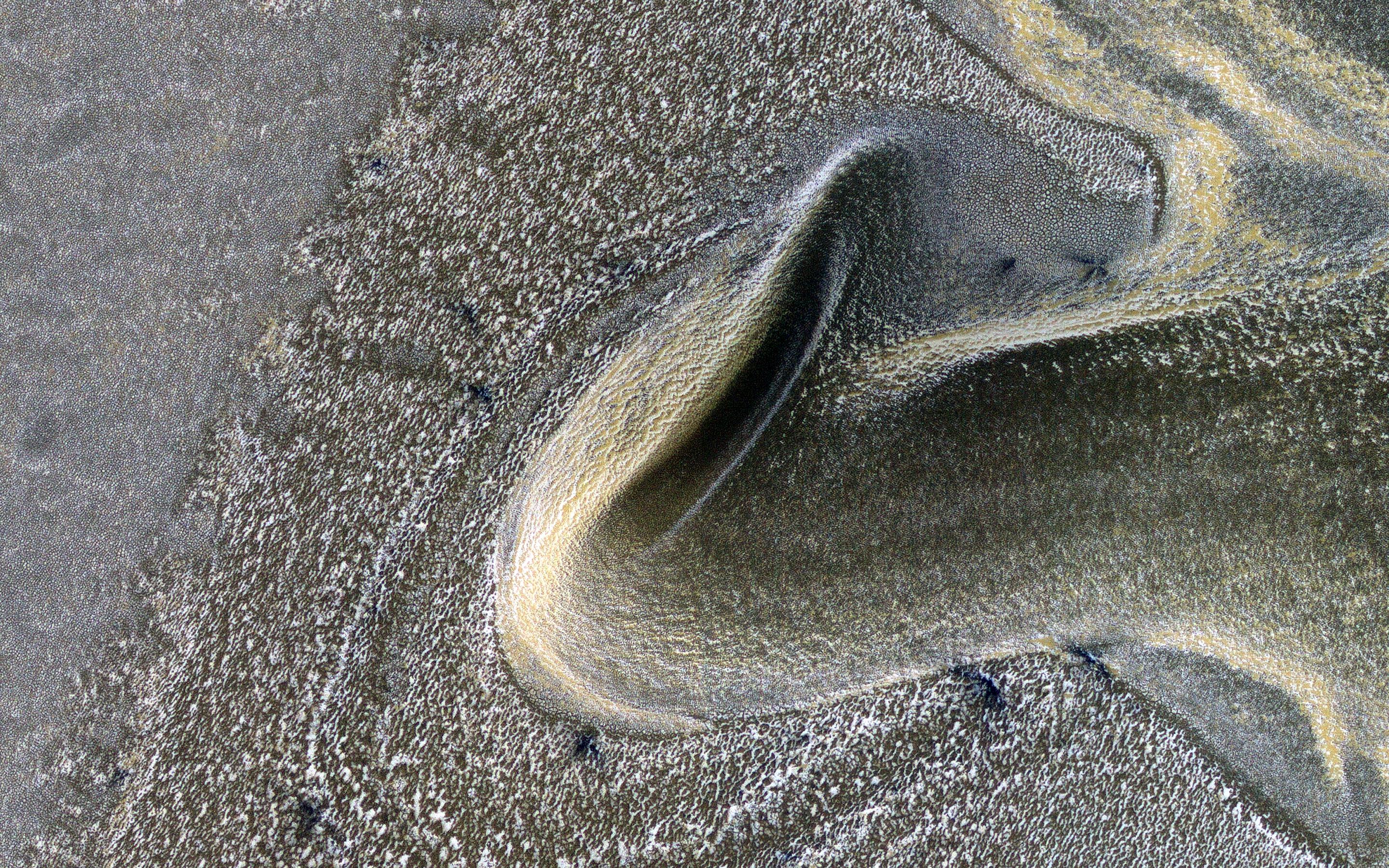 This is the first of a new monitoring series to track seasonal processes. It is also a striking image with late winter angled illumination over dunes covered by carbon dioxide frost mixed with dust.