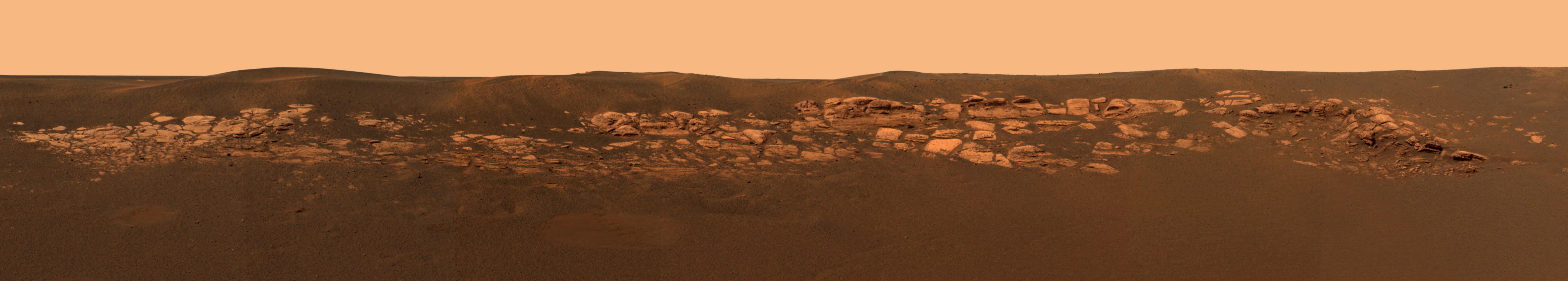 This high-resolution image captured by the Mars Exploration Rover Opportunity's panoramic camera highlights the puzzling rock outcropping that scientists are eagerly planning to investigate. Presently, Opportunity is on its lander facing northeast; the outcropping lies to the northwest. These layered rocks measure only 10 centimeters (4 inches) tall and are thought to be either volcanic ash deposits or sediments carried by water or wind. Data from the panoramic camera's near-infrared, blue and green filters were combined to create this approximate, true-color image.