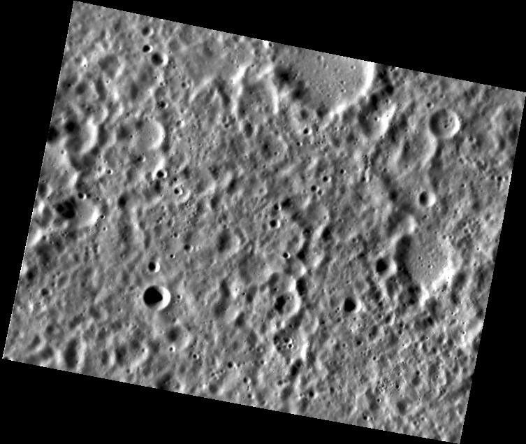 This view of Mercury's surface reveals an abundance of subdued craters that are about 5 km in diameter. These are probably old secondary craters, formed as large chunks ejected by a basin impact fell as a pummeling rain.