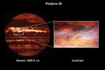 This composite image shows a hot spot in Jupiter's atmosphere. In the image on the left, taken on Sept. 16, 2020, by the Gemini North telescope on the island of Hawaii, the hot spot appears bright in the infrared at a wavelength of 5 microns. In the inset image on the right, taken by Juno's JunoCam visible-light imager, also on Sept. 16 during Juno's 29th perijove pass, the hot spot appears dark.