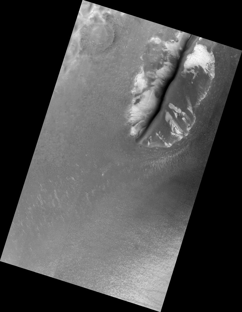 Taken in late southern spring and when Mars is near perihelion (closest distance to the Sun), this image shows the effects of dry ice sublimation on a longitudinal dune in the far Southern hemisphere. The bright patches on the dune are still covered in frost, and the dark regions are frost-free.