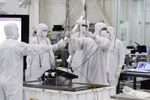 Engineers at NASA's Jet Propulsion Laboratory lift the Mars 2020 rover's bit carousel out of its storage container. The bit carousel is a mechanism that is at the heart of the rover's Sample Caching System. The image was taken on Aug. 5, 2019, in the Spacecraft Assembly Facility's High Bay 1 at JPL.