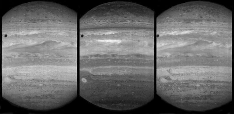 The bright areas in the image frames are caused by solar radiation reflected from clouds and hazes in Jupiter's atmosphere. Dark areas correspond to atmospheric regions where solar radiation is absorbed before it can be reflected. The dark circular feature in the upper left of all three images is the shadow of Jupiter's innermost large moon, Io.