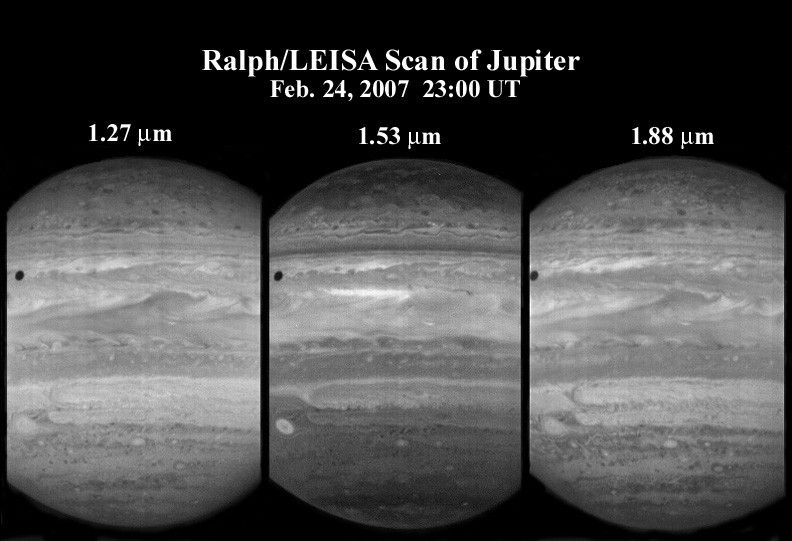 On February 24, 2007, the LEISA (pronounced "Leesa") infrared spectral imager in the New Horizons Ralph instrument observed giant Jupiter in 250 narrow spectral channels. At the time the spacecraft was 6 million kilometers (nearly 4 million miles) from Jupiter; at that range, the LEISA imager can resolve structures about 400 kilometers (250 miles) across.