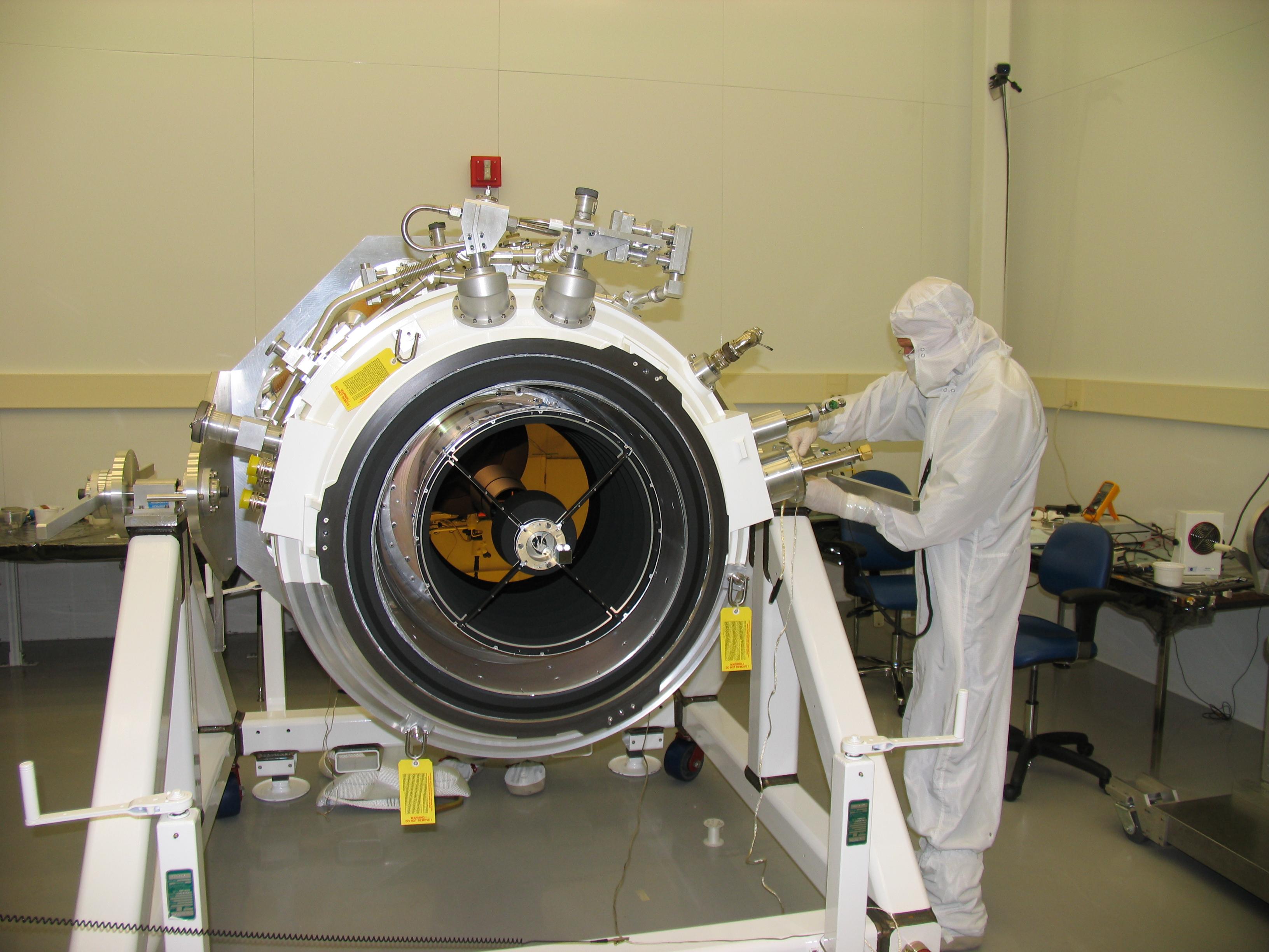 The telescope on the Wide-field Infrared Survey Explorer, or WISE, is shown here with the aperture cover removed. The telescope's primary mirror is located at the end of the open tube. This photo was taken during assembly at the Space Dynamics Laboratory in Logan, Utah.
