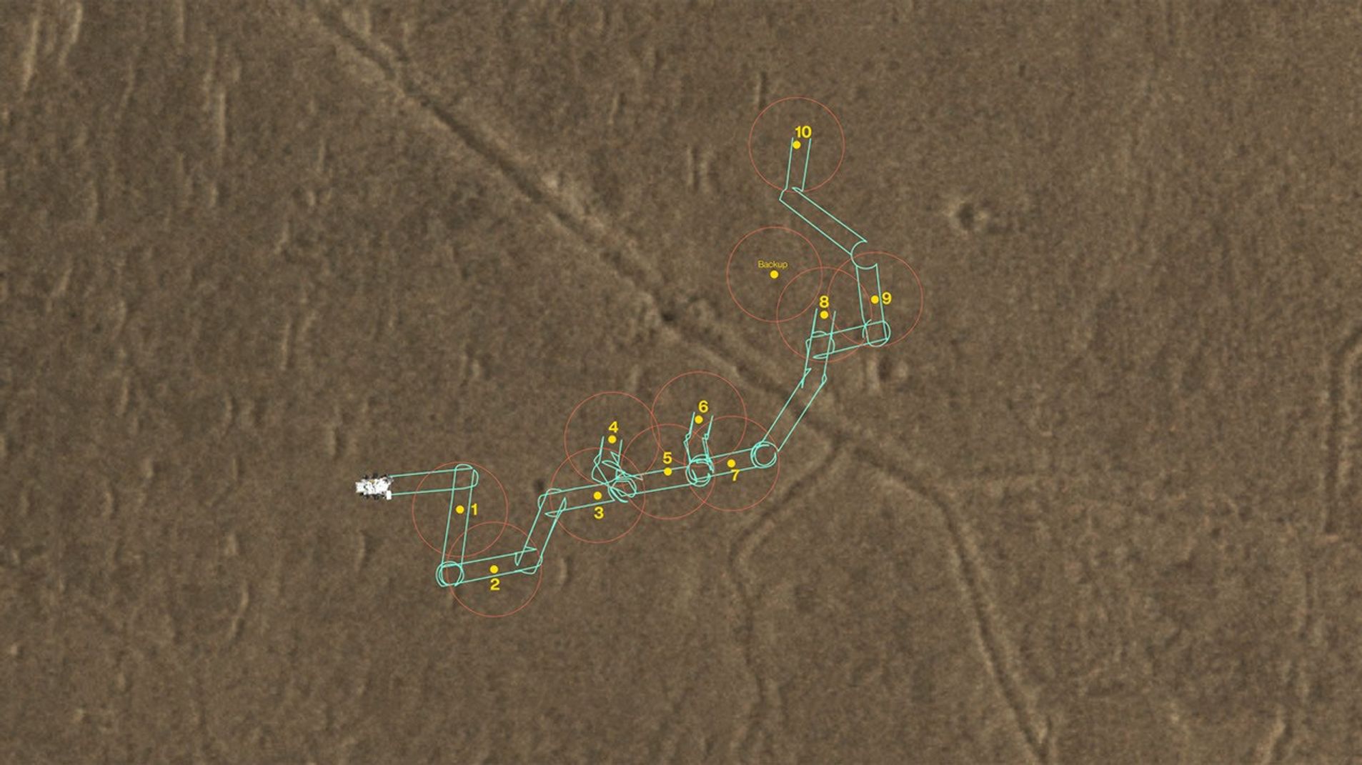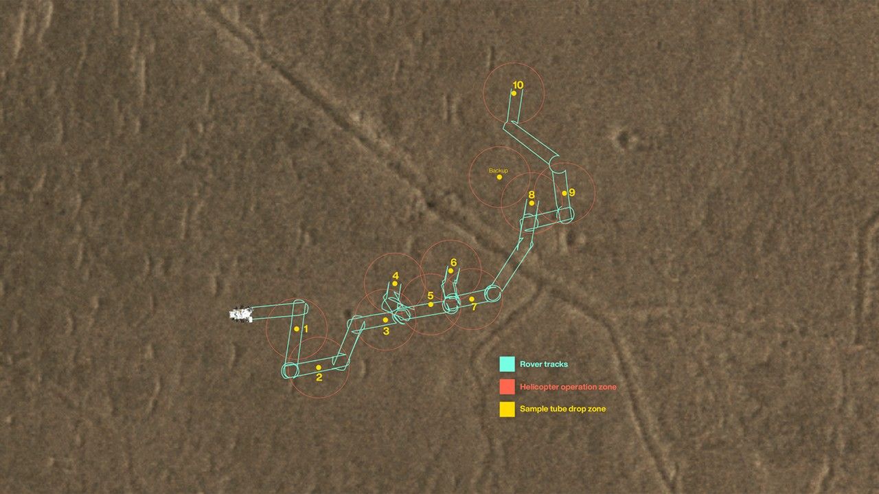 This map shows where NASA's Perseverance Mars rover will be dropping 10 samples that a future mission could pick up. The orange circles represent areas where a Sample Recovery Helicopter could safely operate to acquire the sample tubes.