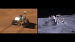 Side-by-side images depict NASA's Curiosity rover (left) and a moon buggy driven during the Apollo 16 mission.