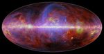 A festive portrait of our Milky Way galaxy shows a mishmash of gas, charged particles and several types of dust. The composite image comes from the European Space Agency's Planck mission, in which NASA plays an important role. It is constructed from observations made at microwave and millimeter wavelengths of light, which are longer than what we see with our eyes.