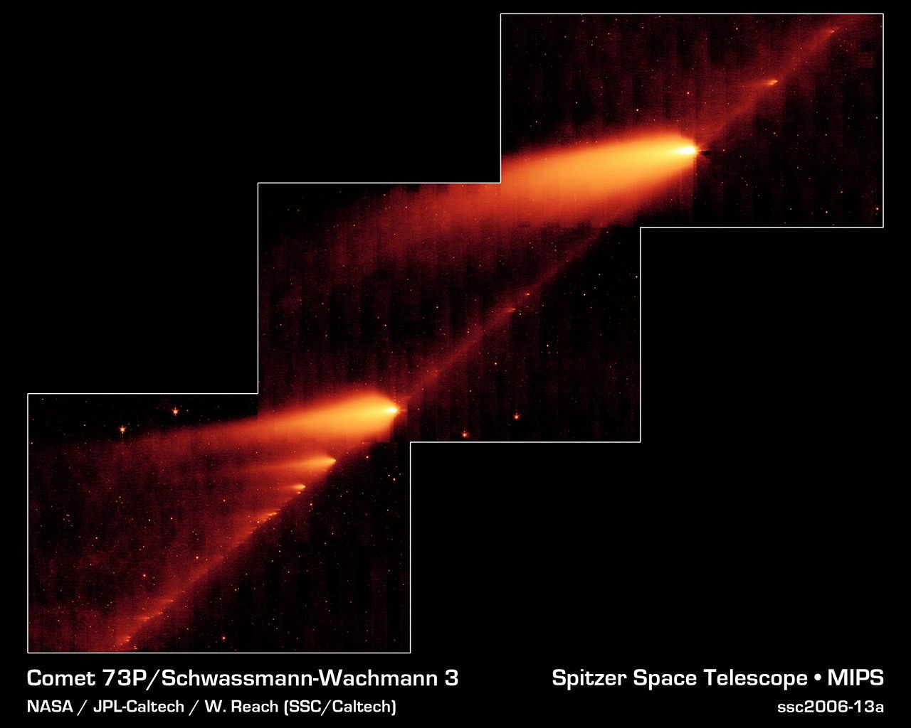 Astronomers are studying the Spitzer image for clues to the comet's composition and how it fell apart. Like NASA's Deep Impact experiment, in which a probe smashed into comet Tempel 1, the cracked Comet 73P/Schwassman-Wachmann 3 provides a perfect laboratory for studying the pristine interior of a comet.
