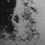 A newly discovered mountain range lies near the southwestern margin of Pluto's heart-shaped Tombaugh Regio (Tombaugh Region), situated between bright, icy plains and dark, heavily-cratered terrain.