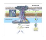 This graphic depicts the evolutionary process of "shallow lightning" and ammonia-water hailstones called "mushballs." An anvil-shaped thunderstorm cloud originates about 40 miles (65 kilometers) below Jupiter's visible cloud deck. Powered by water-based moist convection, the cloud generates strong updrafts that move liquid water and water ice particles upward. About 12 miles (19 kilometers) up, temperatures are so low that all of the water particles turn to ice. Still climbing, the ice particles cross a region located about 14 miles (23 kilometers) below the upper clouds, where temperatures are between minus 121 degrees Fahrenheit (minus 85 degrees Celsius) and minus 150 degrees Fahrenheit (minus 100 degrees Celsius), (depicted as green-hashed layer). At that point, ammonia vapor in the atmosphere acts like an antifreeze, melting the water-ice crystals, transforming them into ammonia-water liquid droplets which then grow and gather a solid icy shell to become mushballs. Once big enough, these slushy hailstones fall down, transporting both ammonia and water into Jupiter's deep atmosphere where the mushballs eventually evaporate.