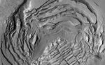 These depressions, found near the northern edge of the ancient highlands, have fractures that indicate collapse toward their centers. This pattern can be found on glaciers that sit atop volcanoes after a small eruption has melted some of the ice.