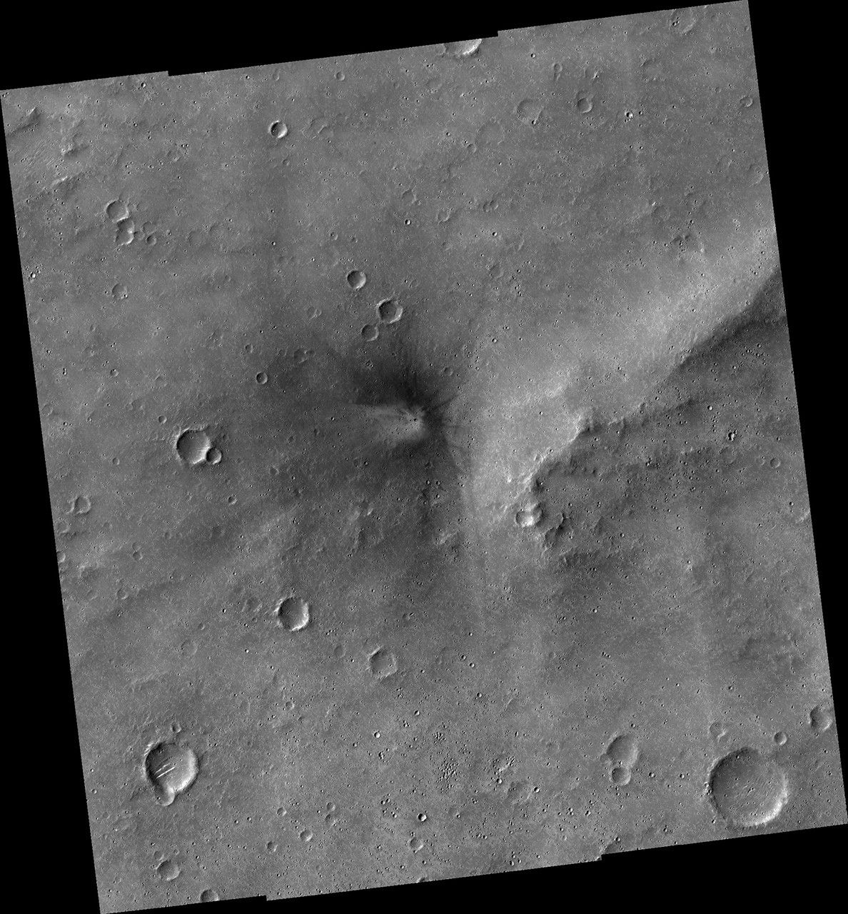 NASA's Mars Reconnaissance Orbiter (MRO) keeps finding new impact sites on Mars. This one occurred within the dense secondary crater field of Corinto Crater, to the north-northeast.