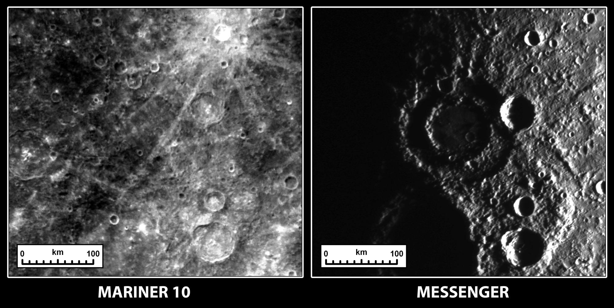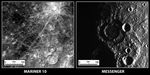 These two images show the same terrain on Mercury as imaged by Mariner 10 in the 1970s and by the MESSENGER spacecraft on October 6, 2008. The reason they look so different is that the angle that the Sun illuminates the surface is dramatically different between the two observations. When Mariner 10 acquired the image on the left, the Sun was high in the sky, which highlights the relative differences in brightness between geologic units on the surface. When the Sun is lower in the sky, as was the case during the second MESSENGER Mercury flyby (right image), shadows become more prominent and it is easier to see the rugged topography of the surface. Most noticeably, a peak-ring impact crater with a diameter of about 150 kilometers (93 miles) is clearly seen in new MESSENGER data, whereas it was nearly invisible in Mariner 10 data. (View images taken by Mariner 10.)