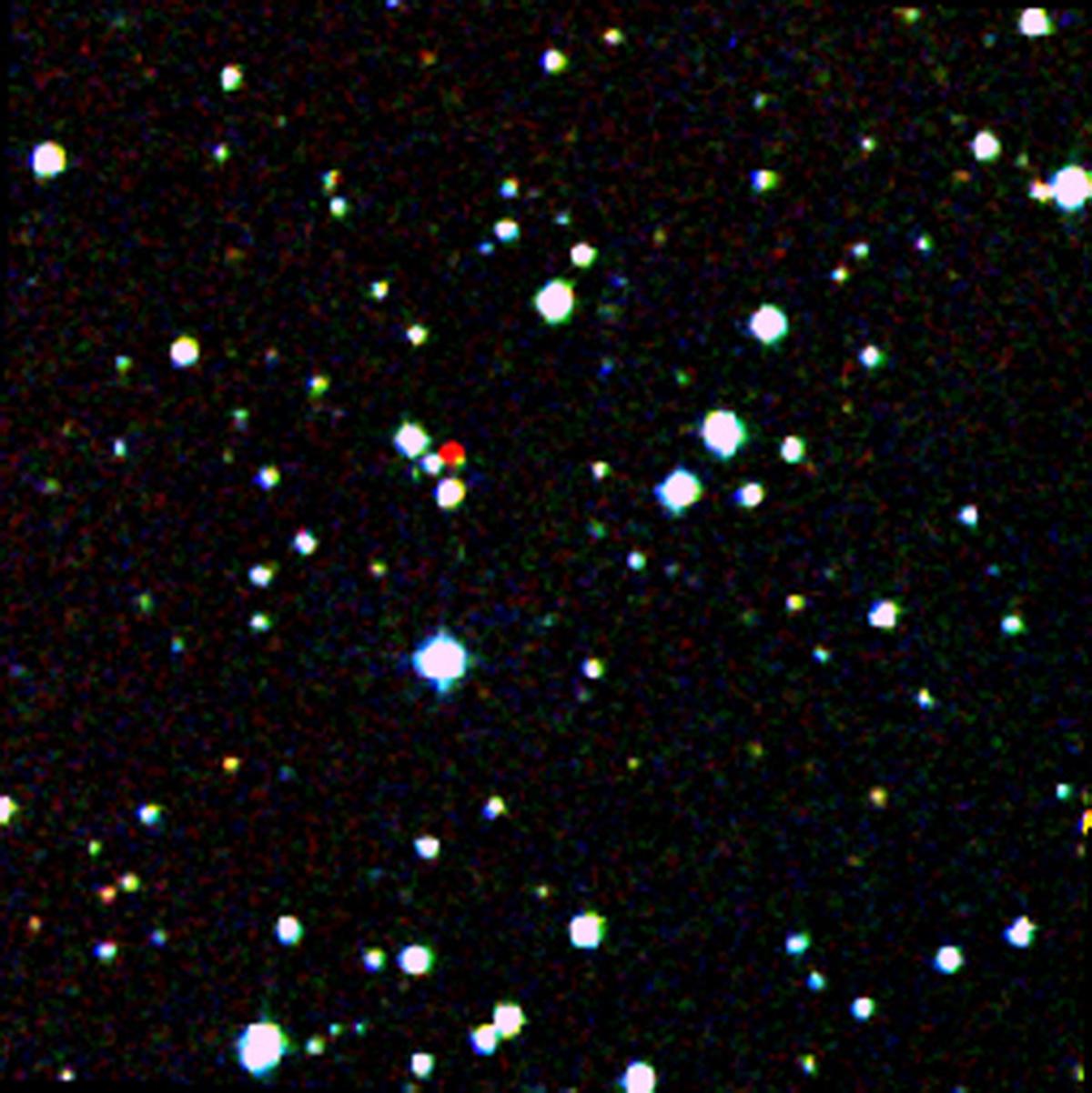 A nearby star stands out in red in this image from the Second Generation Digitized Sky Survey. The star, called WISEA J204027.30+695924.1, was initially discovered using data from NASA's Wide-field Infrared Survey Explorer (WISE), which scanned the entire sky in infrared light in 2010 and early 2011, before ending its primary mission.