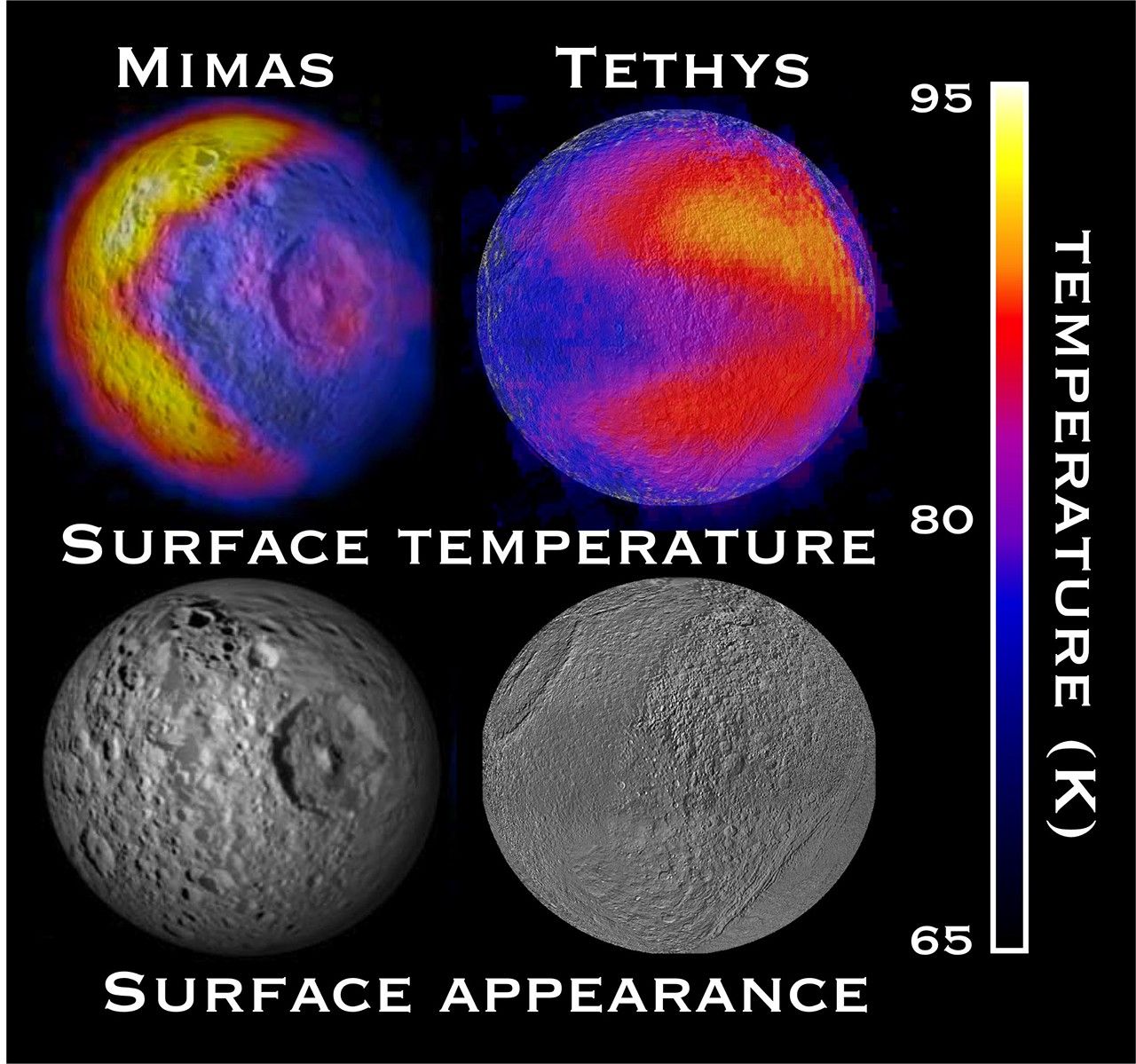 Scientists saw the Tethys Pac-Man in data obtained on Sept. 14, 2011, where daytime temperatures inside the mouth of Pac-Man were seen to be cooler than their surroundings by 29 degrees Fahrenheit (15 kelvins). The warmest temperature recorded was a chilly minus 300 degrees Fahrenheit (90 kelvins). The Mimas Pac-Man was seen in data from Feb. 13, 2010. (For more information, see PIA12867.) The high temperature at Tethys is actually slightly cooler than the warmest temperature at Mimas (about minus 290 degrees Fahrenheit or 95 kelvins). One version of the image pegs white to be the hottest temperatures on both moons -- minus 290 degrees Fahrenheit (95 kelvins) on Mimas and minus 300 degrees Fahrenheit (90 kelvins) on Tethys. Another version shows the minus 290 degrees Fahrenheit (95 kelvins) as white on both moons, revealing a subtler temperature variation on Tethys. Unannotated images of the two color schemes are also available.
