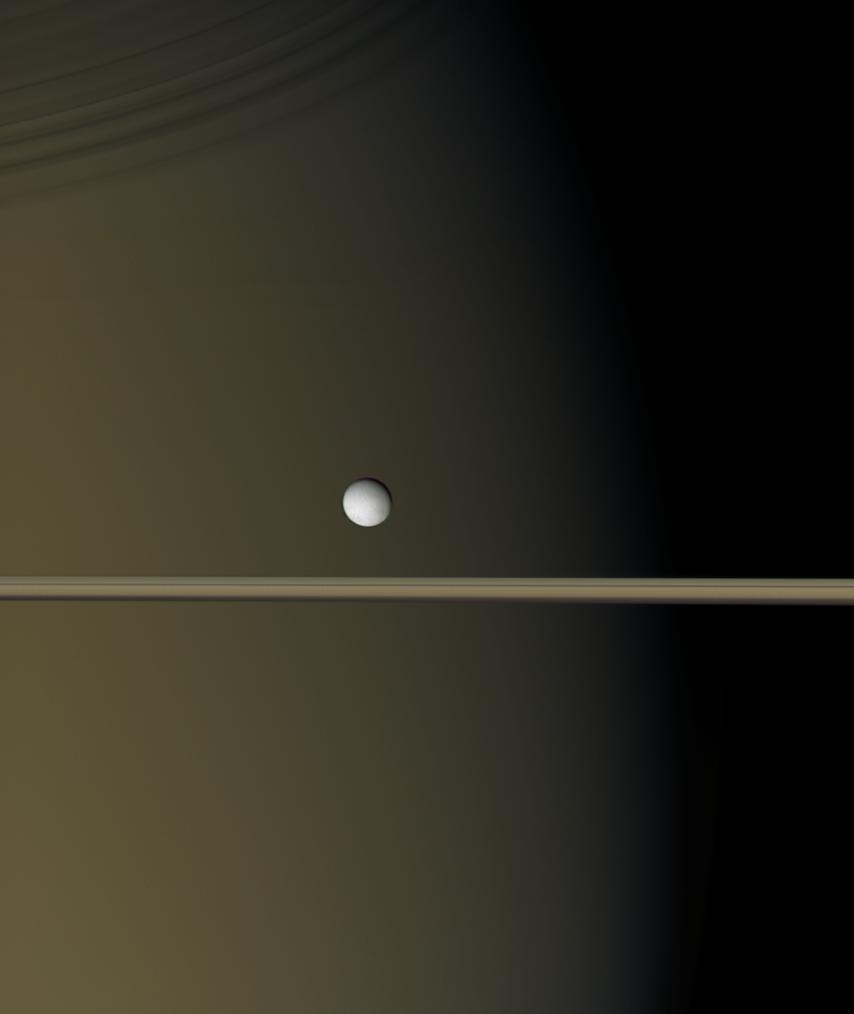 Enceladus hangs like a single bright pearl against the golden-brown canvas of Saturn and its icy rings. Visible on Saturn is the region where daylight gives way to dusk. Above, the rings throw thin shadows onto the planet.