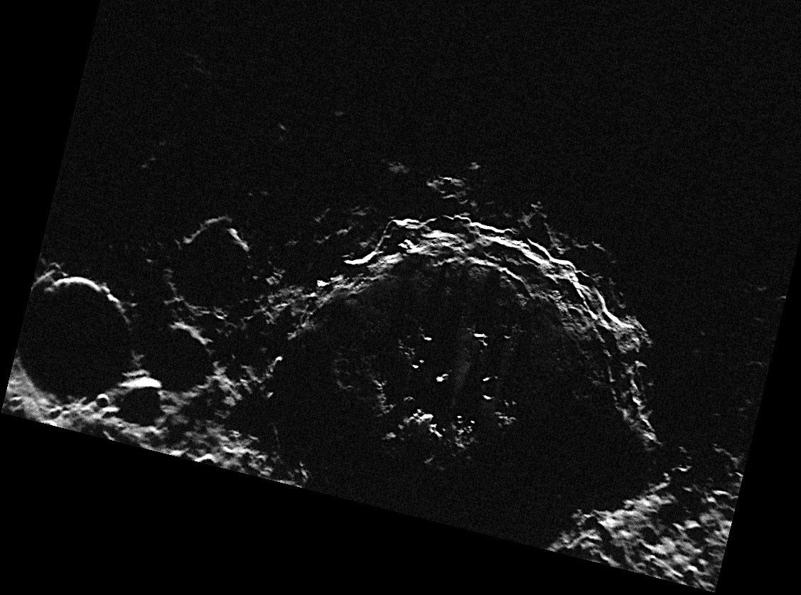 Located very near Mercury's south pole, the crater Chao Meng-Fu receives only grazing sunlight. In fact, MDIS's WAC south polar monitoring campaign has revealed that much of Chao Meng-Fu's floor receives no sunlight at all. In this NAC image, some of the central peaks of Chao Meng-Fu, illuminated by the low sun, can be seen peeking up from the crater's floor and casting long shadows across the crater.