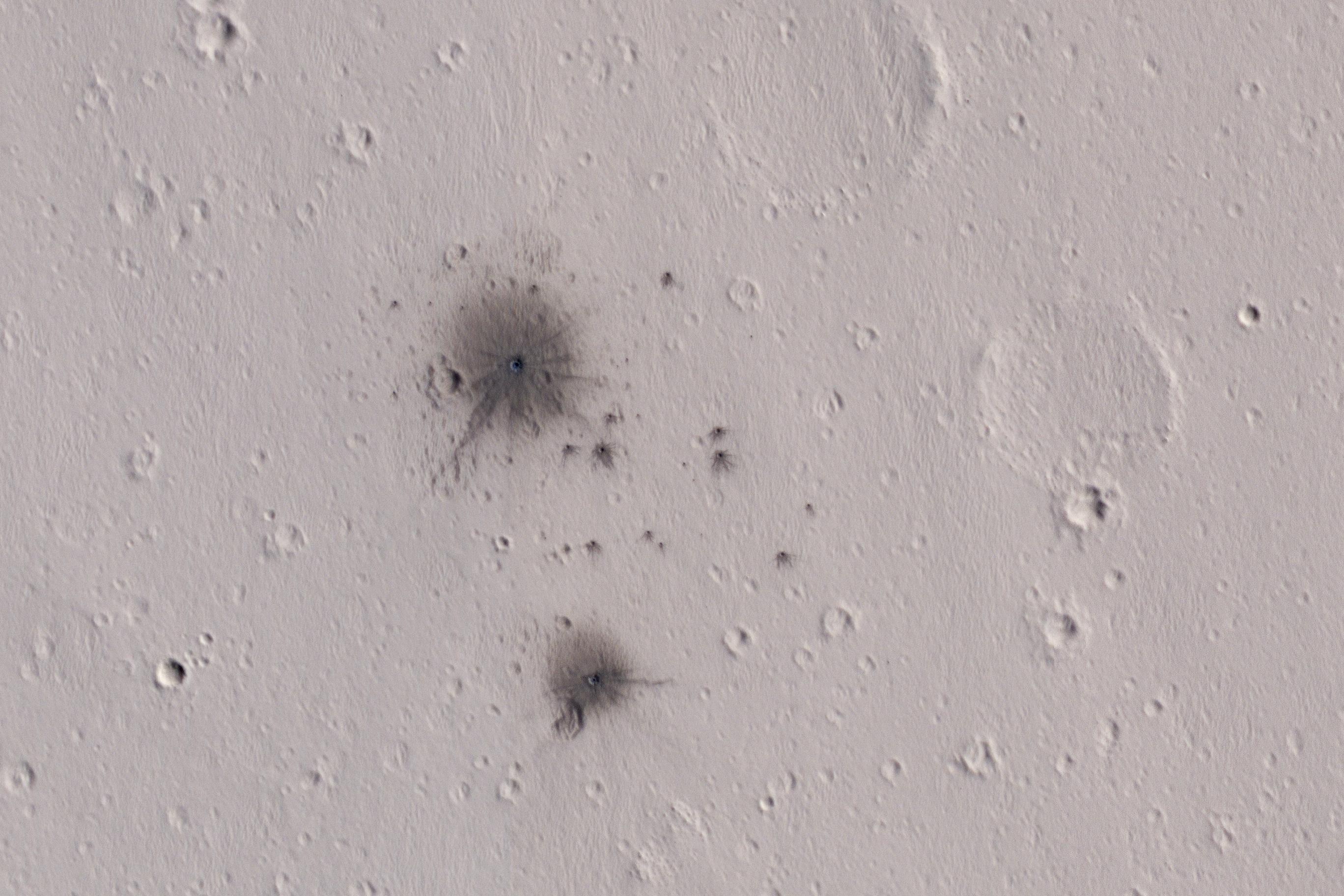 The dark spots in this enhanced-color infrared image are the recent impact craters that occurred in the Tharsis region between 2008 and 2014. These impact craters were first discovered by the Mars Context Camera (or CTX, also onboard the Mars Reconnaissance Orbiter) as a cluster of dark spots. The meteoroid that formed these craters must have broken up upon atmospheric entry and fragmented into two larger masses along with several smaller fragments, spawning at least twenty or so smaller impact craters.