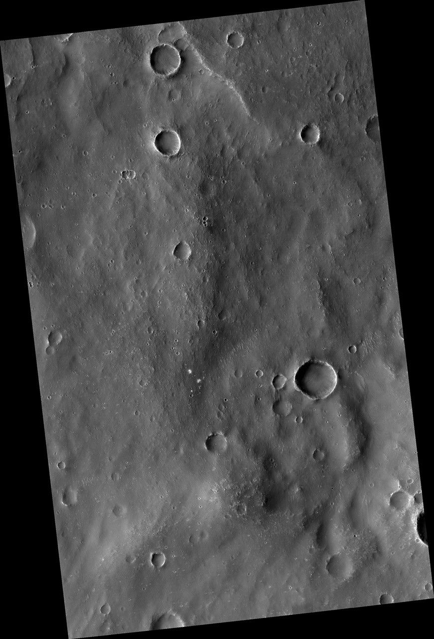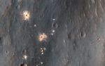Our image depicts 21 distinctive craters ranging in size from 1 to 7 meters in diameter. They are distributed over an area that spans about 305 meters. Most observed recent impacts expose darker-toned materials underlying bright dusty surfaces. However, this impact does the opposite, showing us lighter-toned materials that lie beneath a darker colored surface.