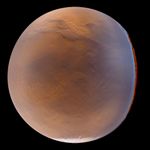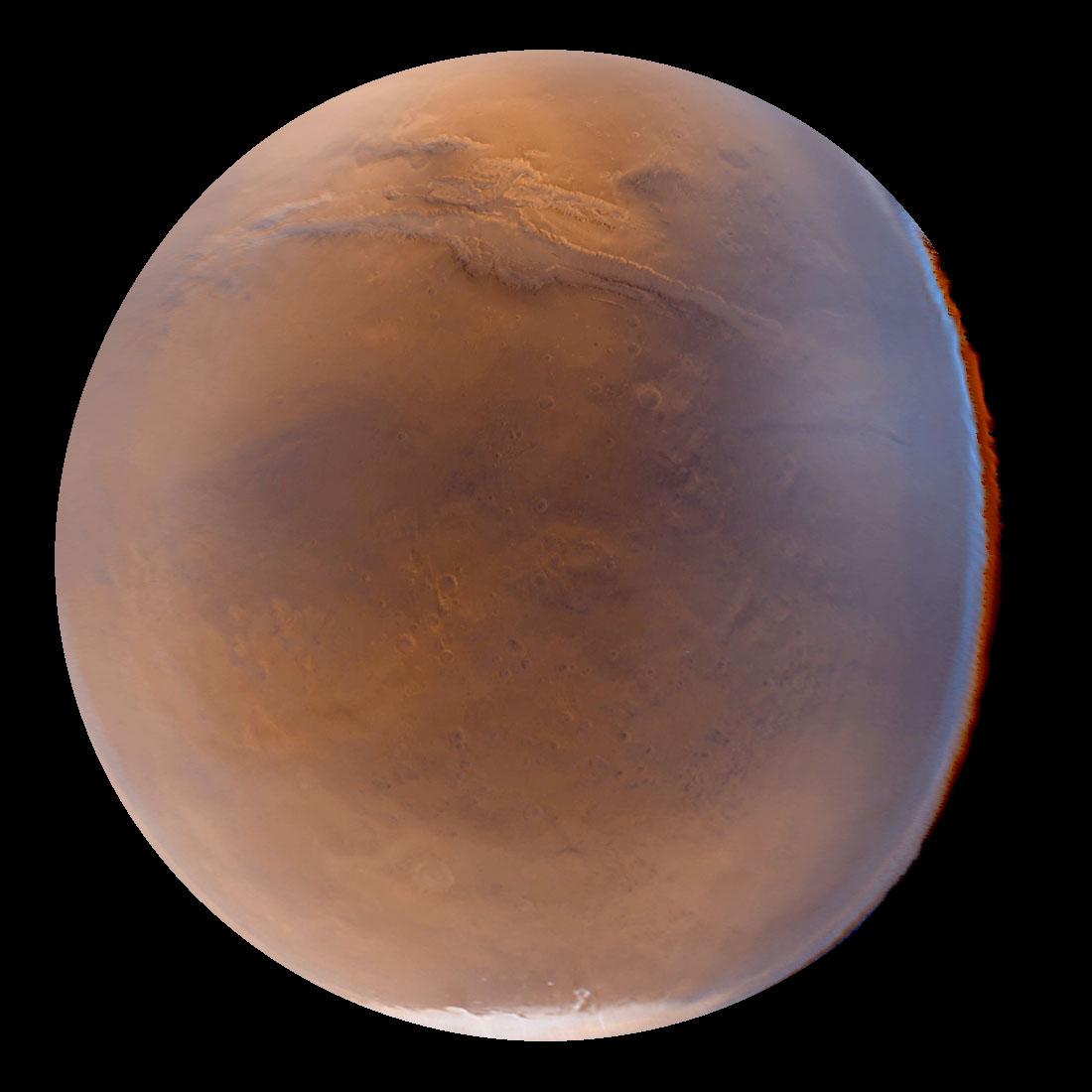 The MOC wide angle cameras, although of very low resolution, have the advantage of areal and color coverage. Unfortunately, they suffer from extremely distorted viewing geometry during the present aerobraking orbit, stemming from the need to rotate the spacecraft to acquire images while the spacecraft altitude and latitude varies. However, by combining knowledge of the spacecraft motion and pointing with understanding of the distortions within the camera lenses, it is possible to reconstruct the data as if viewed from a specific point in the orbit. Such a reconstruction is shown in the image above, a view of Mars as it would appear to a person with a wide angle lens at a altitude of about 2700 km (1690 mi) above 30 degrees South latitude, 70 degrees West longitude. It is reproduced here at close to its original, 7.4 km (4.6 mi) resolution. About 100 degrees of latitude and longitude are visible, with the seasonal south polar carbon dioxide frost cap at the bottom and a portion of the Valles Marineris stretching across the upper quarter of the picture. Color fringing along the right side of the image, and the slightly non-circular outline of the edge of the planet, result from unmodelled spacecraft attitude relationships and lens distortion as these differ between the two cameras (red and blue; green is synthesized by combining red with blue). This image was taken three weeks after a large regional dust storm had developed, and the hazy appearance, especially towards the edges of the planet, results from atmospheric dust.