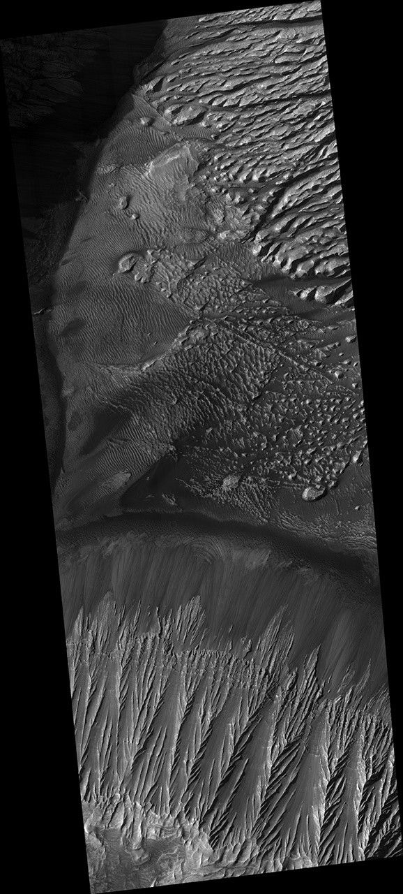 The knobby material showing several lineations in the center of the scene may be remnants of landslides that exposed these tall, steep slopes in this image and just off-scene to the west. Mid-way up the slope (and to a lesser extent all the way up to the top) a series of alternating lighter and darker bands can be traced running east-west across the ridges and troughs of the outcrop. Just below this, dark material is eroding off of the slope, moving downhill, and collecting in fans at the base of the cliff.