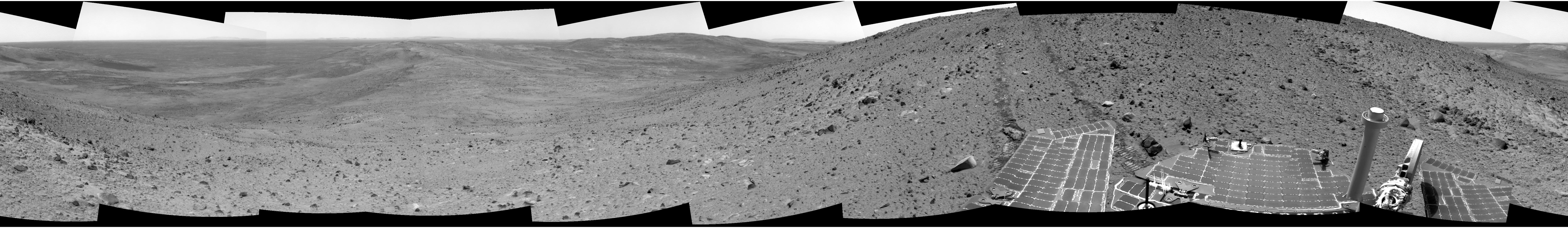 NASA's Mars Exploration rover Spirit continues to descend along the east side of the "Columbia Hills," taking panoramic views of surrounding terrain at the end of each day of driving. This helps members of the science team get a sense of place before proceeding, kind of the way a hiker pauses now and then to view the scenery. Scientists and engineers use panoramas like this to select interesting rocks and soils for further study and to plan a safe path for the rover.
