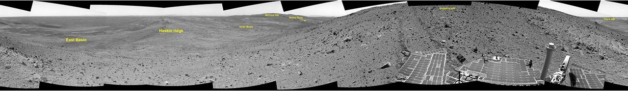 In this image mosaic, Spirit is pausing to take a good look around while descending due east toward a ridge nicknamed "Haskin Ridge." Before driving the rest of the way down, Spirit will take a panoramic image of the large, deep basin to the left of the ridge, labeled "East Basin," which was not visible from the summit. A longer-term destination is the prominent, round, platform-like feature labeled "Home Plate."