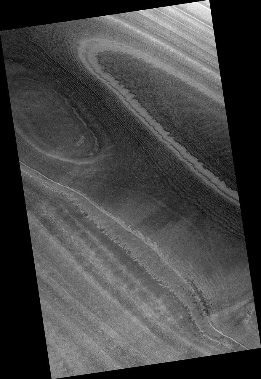 In this image is an exposed section of the north polar layered deposits (NPLD). Like a delicious slice of layered tiramisu, the NPLD is made up of water-ice and dust particles stacked one on top of the other. However, instead of icing, layers are topped with seasonal carbon dioxide frost. We can observe lingering frost adhering to one of the layers.