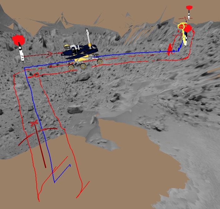 This image shows a screenshot from software used by engineers to drive the Mars Exploration Rover Spirit up toward the rim of the crater dubbed "Bonneville." The software simulates the rover's movements across the martian terrain, helping to plot a safe course. The virtual 3-D world around the rover is built from images taken by Spirit's stereo navigation cameras. Regions for which the rover has not yet acquired 3-D data are represented in beige. The red darts show target destinations. Red lines indicate the path the rover's wheels will follow to reach the target, and the blue line denotes the path of the rover's "belly button," as engineers like to call it.