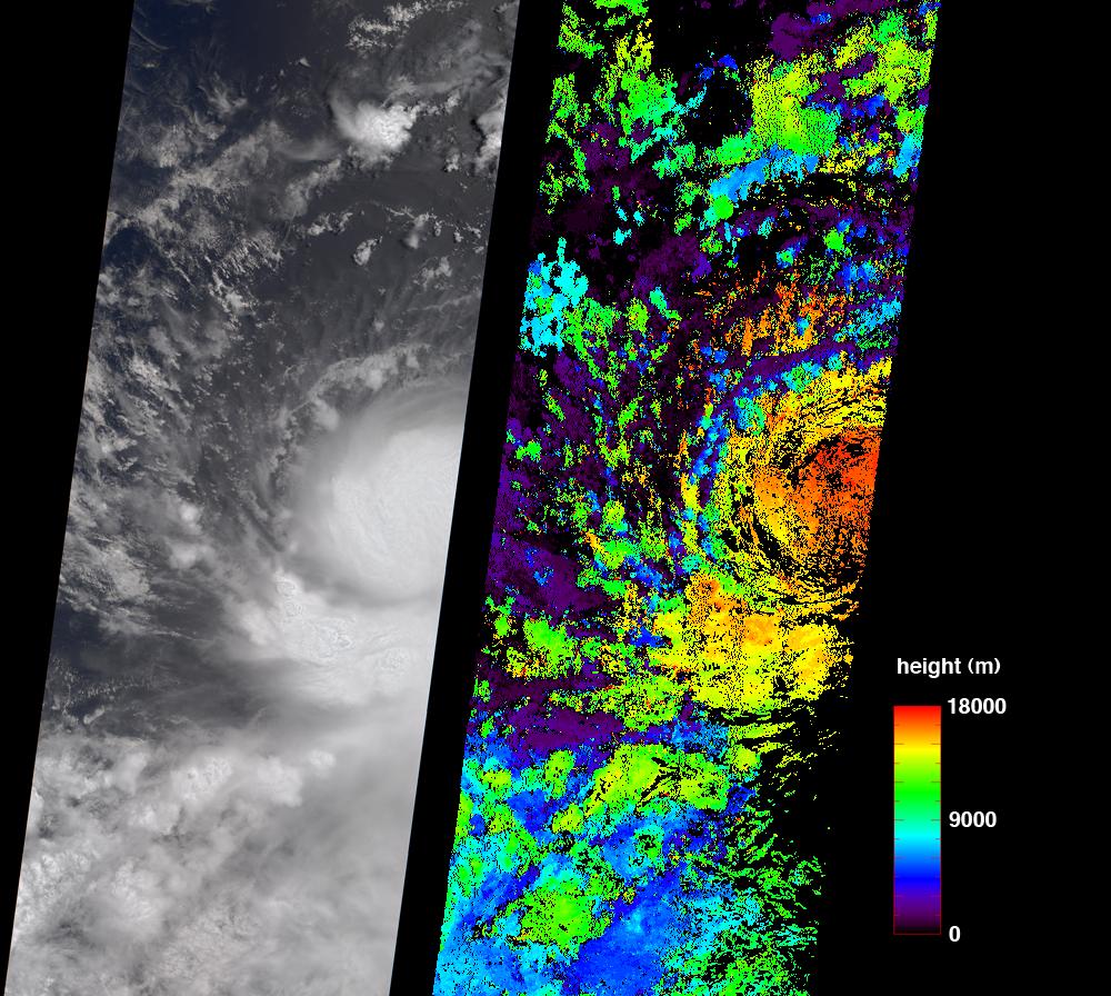 These July 11, 2006 images are from the Multi-angle Imaging SpectroRadiometer (MISR) instrument aboard NASA's Terra Satellite. They show then Tropical Storm Bud as it was intensifying into a hurricane, which it became later that day. The true-color image at left is next to an image of cloud heights on the right. Two-dimensional maps of cloud heights such as these give scientists an opportunity to compare their models against actual hurricane observations.