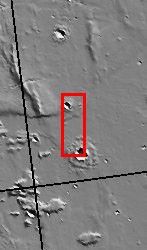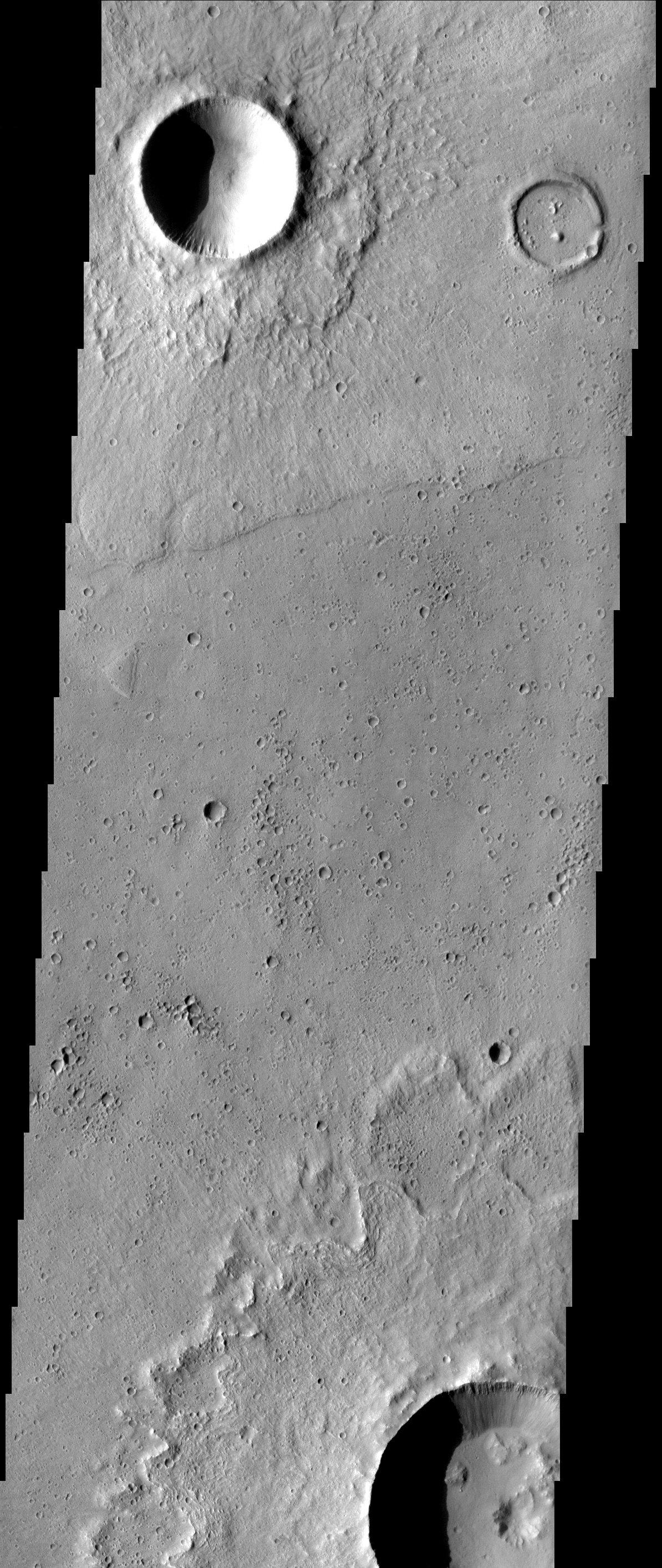 In western Acidalia, two craters of similar size (a few km's) dramatically display the effects of geologic activity. The younger one on the left has been left relatively well preserved, retaining a sharp rim crest, a classic bowl shape, and a clearly defined ejecta blanket. The older one on the right likely has experienced a flood of lava that covered over the ejecta and filled in the bowl (note the breach in the rim). Its rim crest has been worn down by a multitude of subsequent impacts.