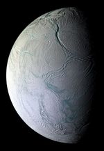 On Oct. 9, 2008, just after coming within 25 kilometers (15.6 miles) of the surface of Enceladus, NASA's Cassini captured this stunning mosaic as the spacecraft sped away from this geologically active moon of Saturn.