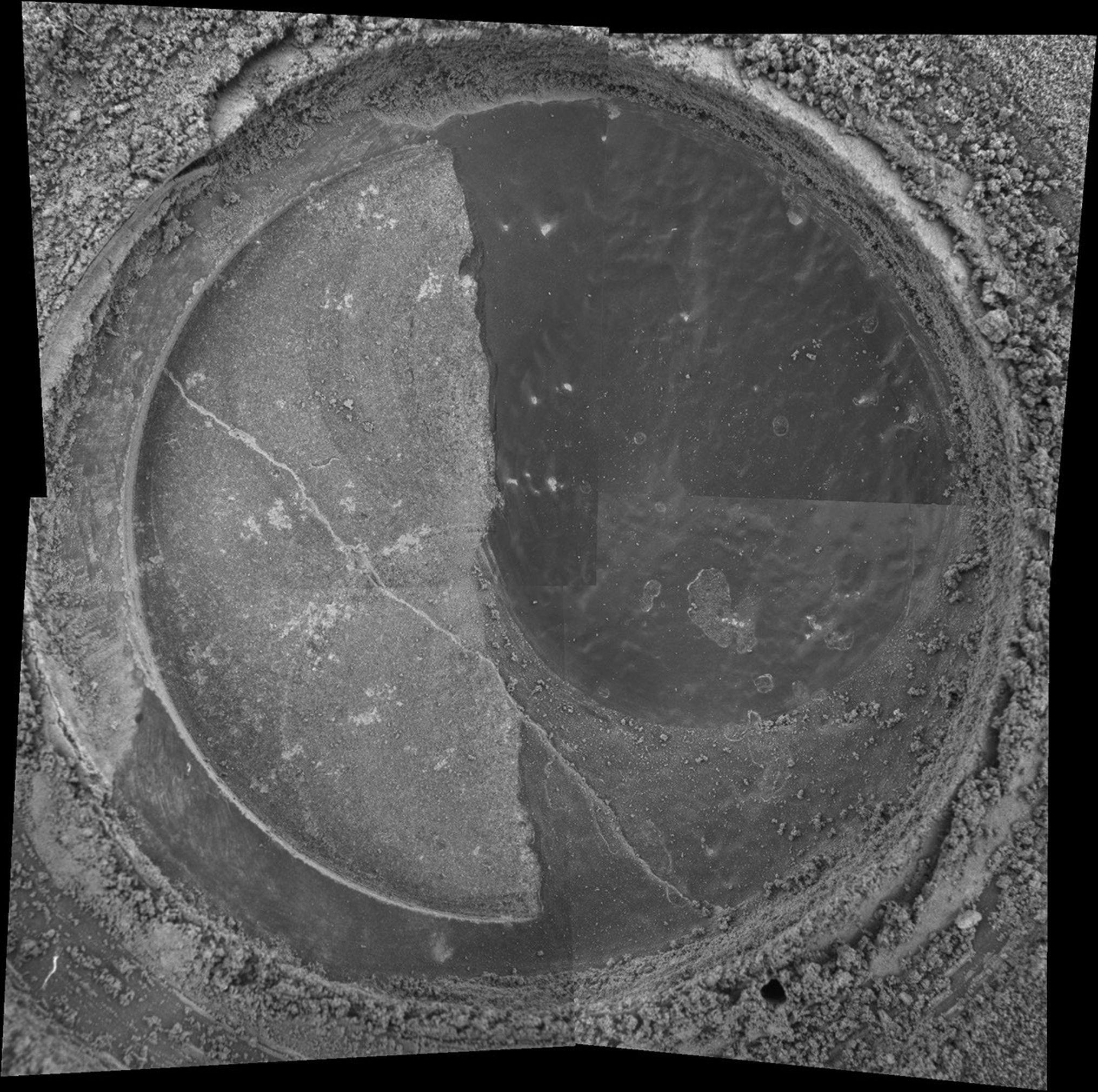 NASA's Mars Exploration Rover Spirit took the four images that make up this mosaic with its microscopic imager on sol 82. The mosaic reveals the drilled surface of the target called "New York" on the rock dubbed "Mazatzal." The rock abrasion tool ground for 3 hours and 45 minutes to create this 3.8 millimeter-deep (0.15 inch) hole. The exposed area is 4.5 centimeters (1.8 inches) in diameter.