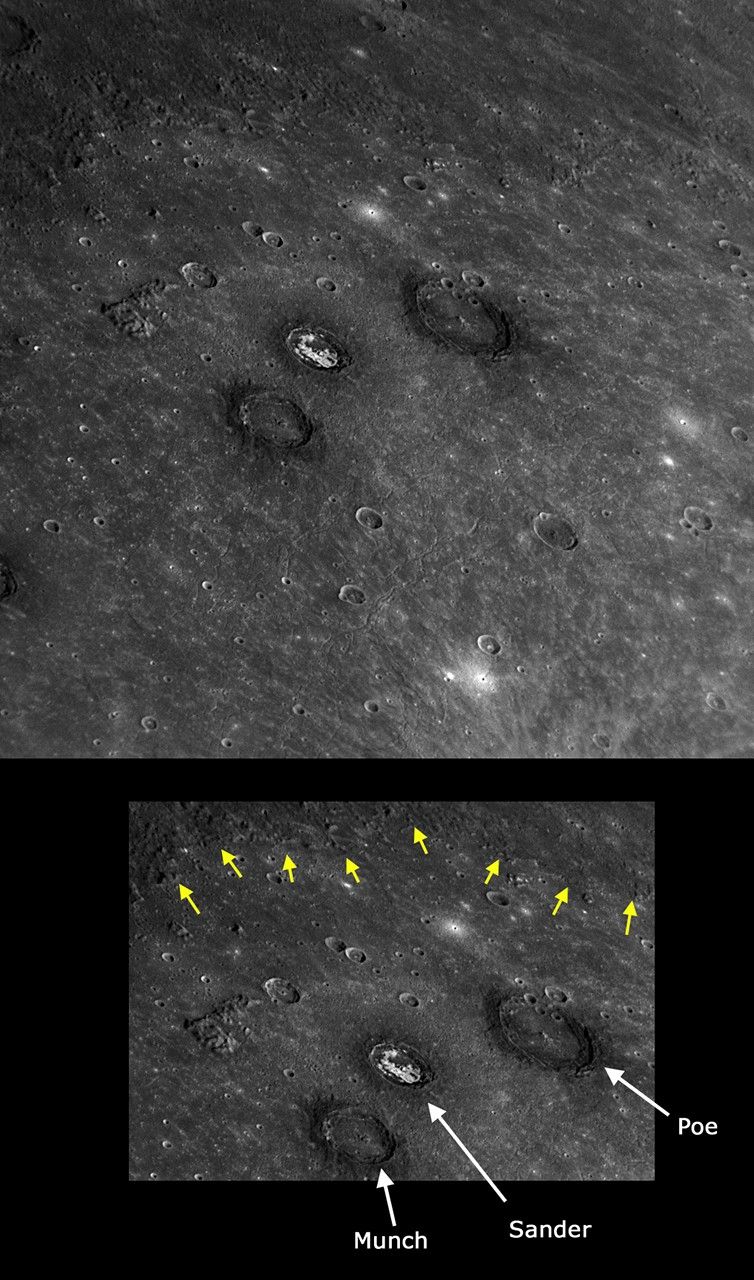 Sander, Munch, and Poe are a trio of impact craters within the Caloris impact basin (PIA10359). Munch and Poe were recently named (PIA11762), while Sander received its name in the first set of feature names (PIA10611) after MESSENGER’s first Mercury flyby. Munch is named for Edvard Munch (1863-1944), the Norwegian artist and painter of The Scream. The crater Poe takes its name from Edgar Allan Poe, the 19th century American writer and poet. Sander is named for the German photographer August Sander (1876-1964). Sander crater exhibits very bright material within its crater rim, while Munch and Poe each are surrounded by dark material. The presence of both bright and dark materials suggest that there is a diversity of rock types on and below Mercury's surface, with different mineralogical compositions from those of the volcanic plains that comprise the majority of the floor of Caloris basin. The three craters are located in the far northern part of the Caloris basin. The basin rim (PIA10942), indicated by yellow arrows, can be seen in the upper left and extending across the top of this image, and many fractures within Caloris basin (PIA10606) are visible in the lower portion of this image.