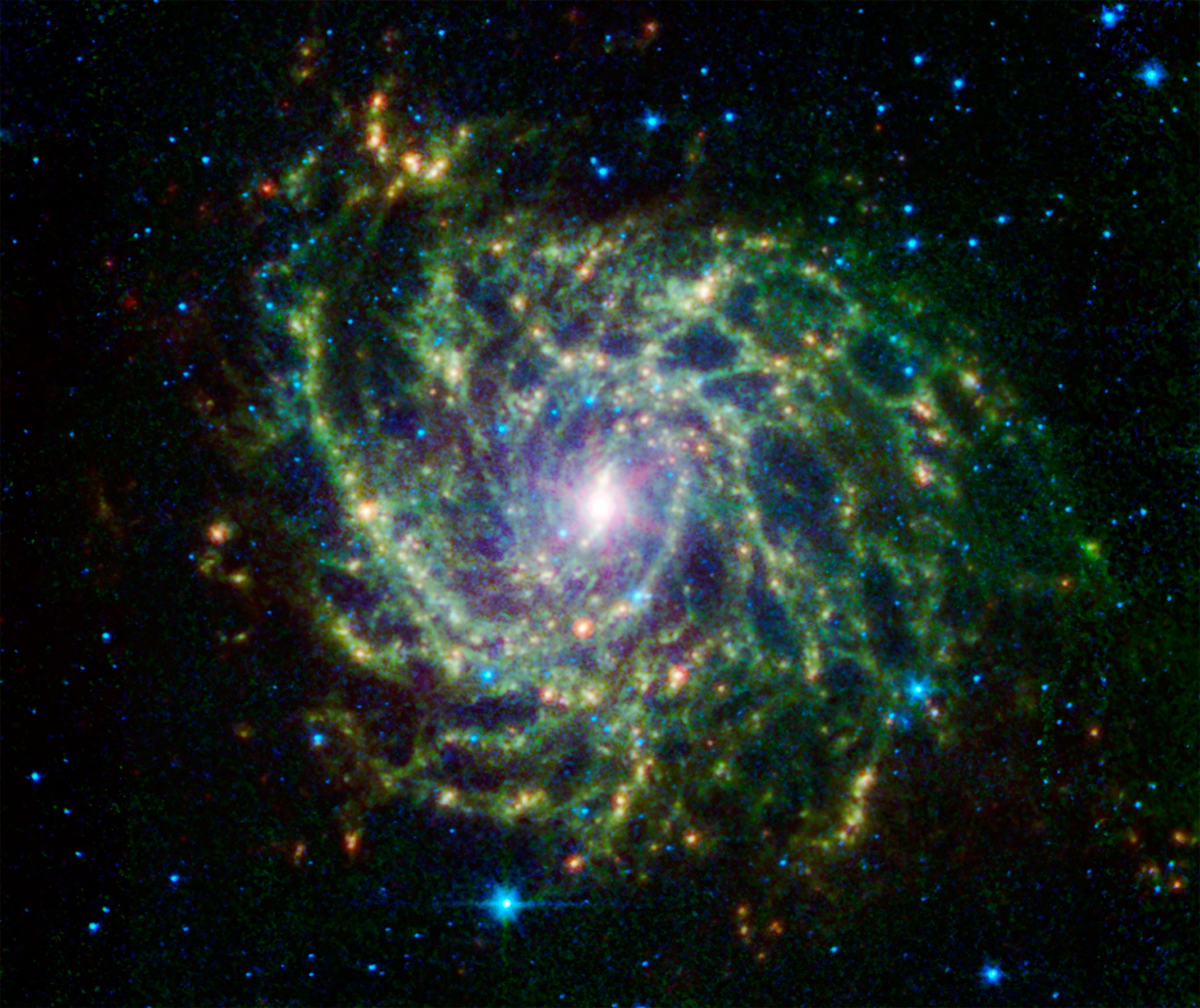 Data from Spitzer's infrared array camera (IRAC) are shown in blue (3.6 and 4.5 microns) and green (5.8 and 8.0 microns), while the multiband imaging photometer (MIPS) observation is red (24 microns).